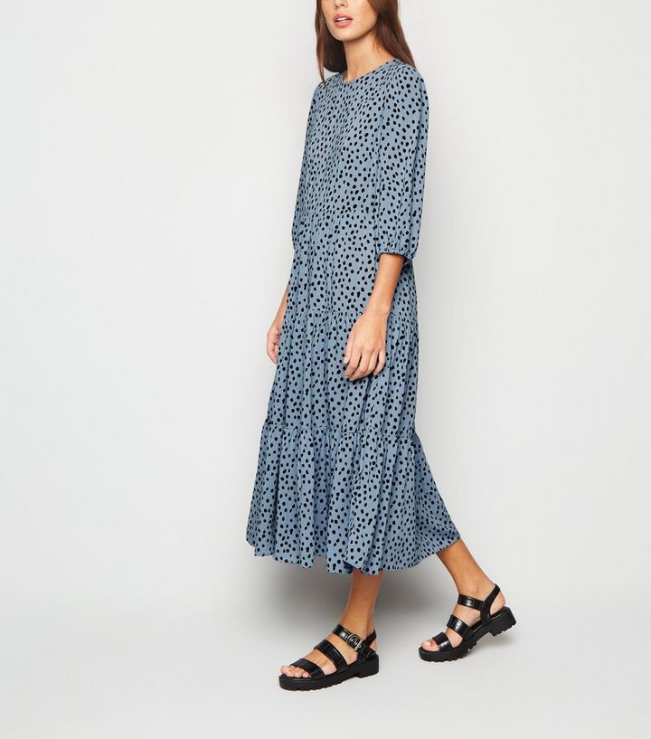 New Look Tiered Smock Midi Dress In Blue Spot Print Asos